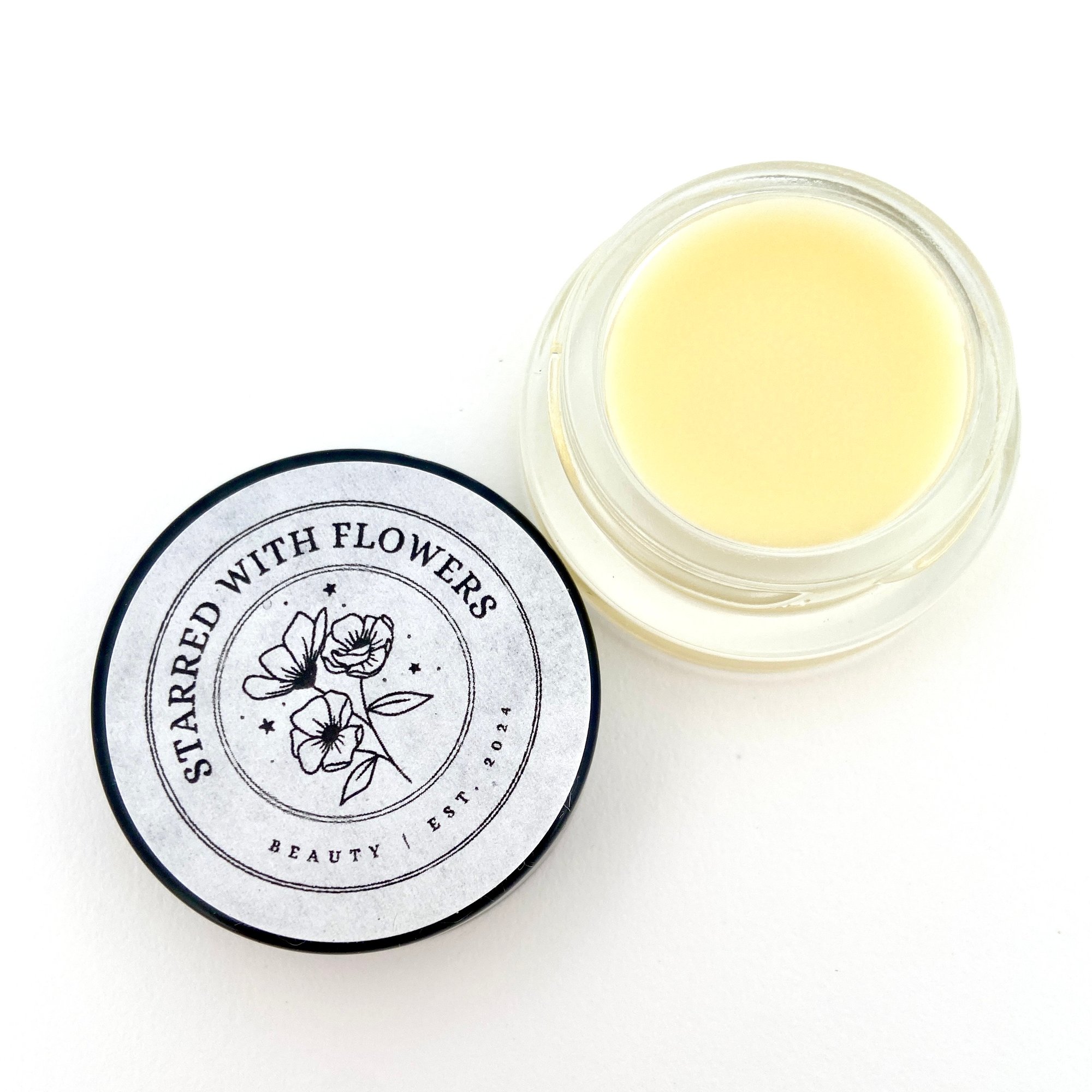 A simple and hydrating lip balm that's handmade with all natural ingredients and hand poured into clear glass jars.